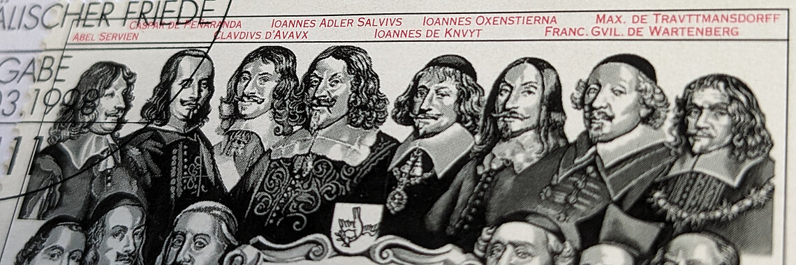 Bildnachweis Header: Jubiläumsbriefmarke, 350 Jahre Westfälischer Friede (1648), Erstausgabe 12.03.1998, Bonn © Jubiläumsbrief von 1998 frankiert mit Jubiläumsbriefmarke, Zentrum für Historische Friedensforschung (ZHF) der Rheinischen Friedrich-Wilhelms-Universität Bonn.